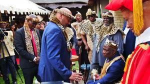 His Royal Highness King Tikoe Tefo Meshack Lekitlane hands newly coronated King Dr. Ruben M. West his staff.
